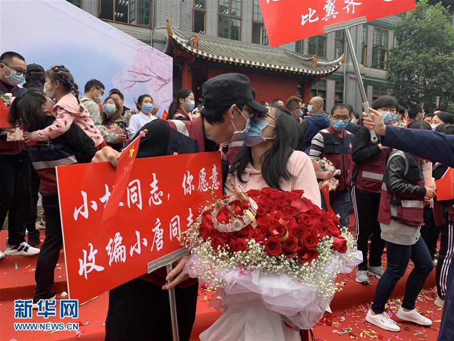 4月21日,在四川大學(xué)華西醫(yī)院,醫(yī)療隊(duì)隊(duì)員向女友現(xiàn)場(chǎng)求婚。當(dāng)日,來(lái)自四川大學(xué)華西醫(yī)院、華西第二醫(yī)院、華西第四醫(yī)院的醫(yī)療隊(duì)隊(duì)員解除隔離休整,與分別許久的家人、同事團(tuán)聚,緊緊相擁。新華社記者盧宥伊攝