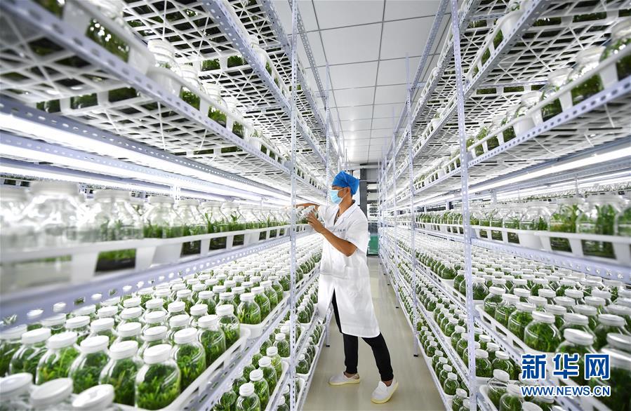 4月21日,在位于施茶村的海南勝嶸生物科技有限公司石斛育種培養(yǎng)室內(nèi),工作人員查看石斛種苗的生長(zhǎng)情況。新華社記者郭程攝