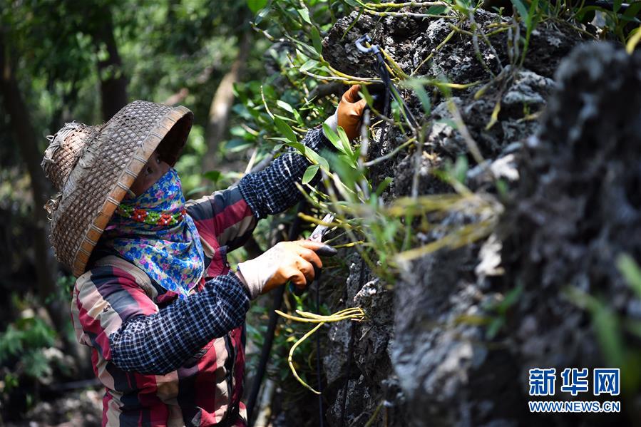 4月21日,施茶村村民黃風(fēng)厲在石斛園清理雜草。新華社記者郭程攝