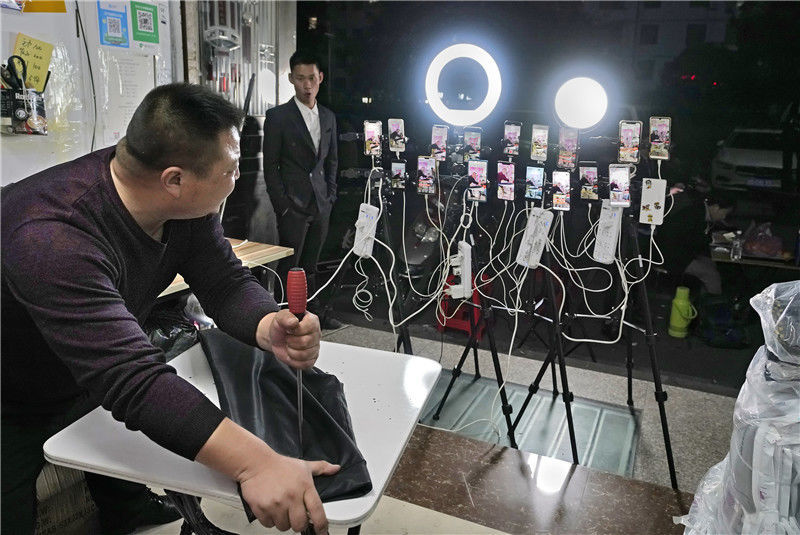 2019年11月11日,浙江金華,義烏北下朱村,在一家床上用品銷售商店,一名男子正在直播。這個(gè)網(wǎng)名叫“點(diǎn)子大哥”的男子姓劉,49歲,來(lái)自杭州農(nóng)村,有三年半的直播經(jīng)歷。