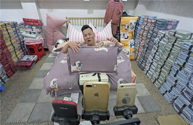 2019年11月11日,浙江金華,義烏北下朱村,在一家床上用品銷售商店,一名男子正在直播。這個網(wǎng)名叫“點子大哥”的男子姓劉,49歲,來自杭州農(nóng)村,有三年半的直播經(jīng)歷。