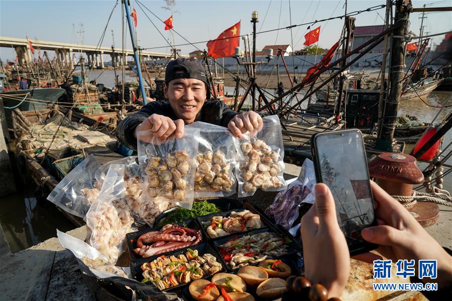 4月22日,31歲的顧峻豪(左)在朱蓬口漁港拍攝短視頻推銷海產(chǎn)品。他從去年9月起開(kāi)始做網(wǎng)絡(luò)主播銷售海產(chǎn)品,目前已有12萬(wàn)粉絲。新華社記者楊磊攝