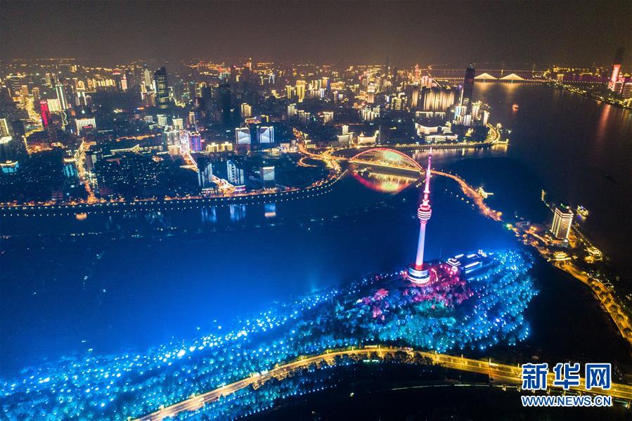 這是4月7日晚在武漢龜山拍攝的夜景(無人機(jī)照片)。新華社記者肖藝九攝