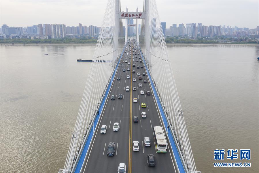 4月14日,武漢長(zhǎng)江二橋上車流如織(無人機(jī)照片)。新華社記者才揚(yáng)攝
