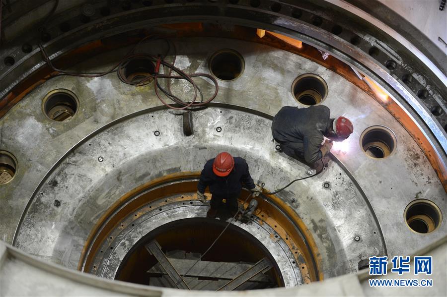 4月24日,一名工人在施工現(xiàn)場安裝機組轉(zhuǎn)子磁極引線和阻尼環(huán)。新華社記者韓曉雨攝