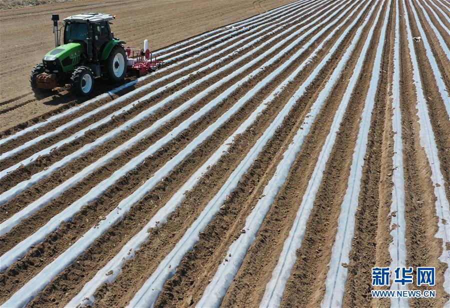 4月25日,灤南縣東黃坨鎮(zhèn)新戶村農(nóng)民使用拖拉機給準備栽植煙薯秧苗的土地開溝覆膜(無人機照片)。近年來,河北省灤南縣利用當?shù)赝寥篮蜌夂蛱攸c,引導農(nóng)民因地制宜發(fā)展煙薯種植,取得良好效果。目前該縣煙薯種植面積達3萬多畝,每畝年收入達5000多元。新華社記者楊世堯攝