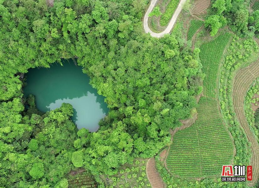 2020年4月24日,在湖南張家界市永定區(qū)“百里畫廊”茅巖河景區(qū)拍攝的“天坑心湖”。(無人機(jī)拍攝)