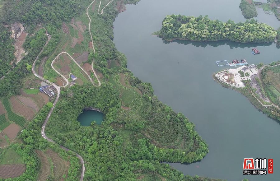 2020年4月24日,在湖南張家界市永定區(qū)“百里畫(huà)廊”茅巖河景區(qū)拍攝的“天坑心湖”。(無(wú)人機(jī)拍攝)