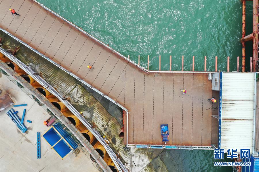 4月25日,幾名工人從海上生活區(qū)前往工地(無(wú)人機(jī)照片)。