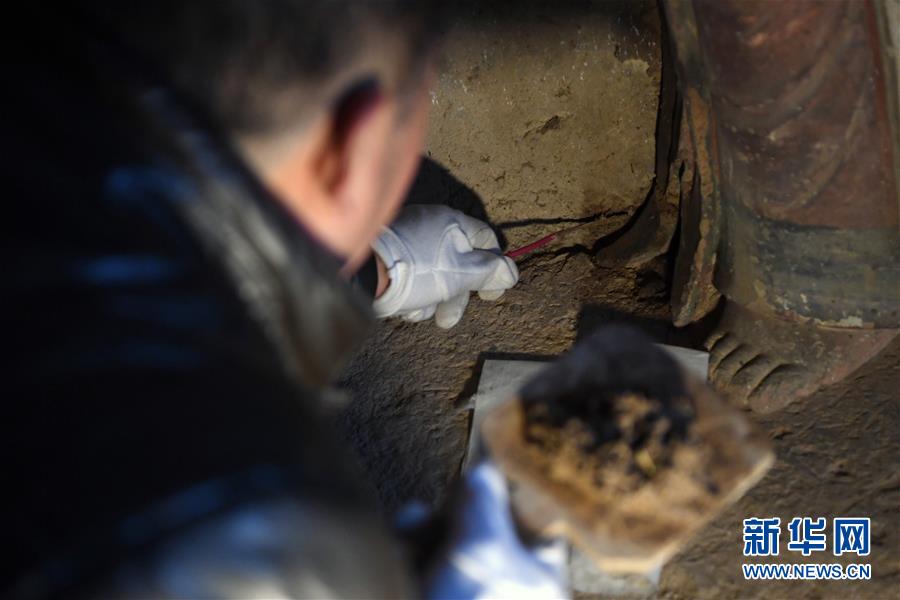 12月25日,在麥積山石窟第11窟,修復(fù)師牟常有對(duì)塑像破損處進(jìn)行加固處理。新華社記者馬寧攝