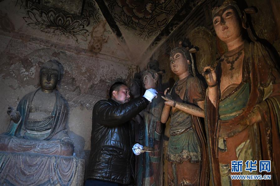 12月25日,在麥積山石窟第11窟,修復(fù)師牟常有對(duì)塑像破損處進(jìn)行加固處理。