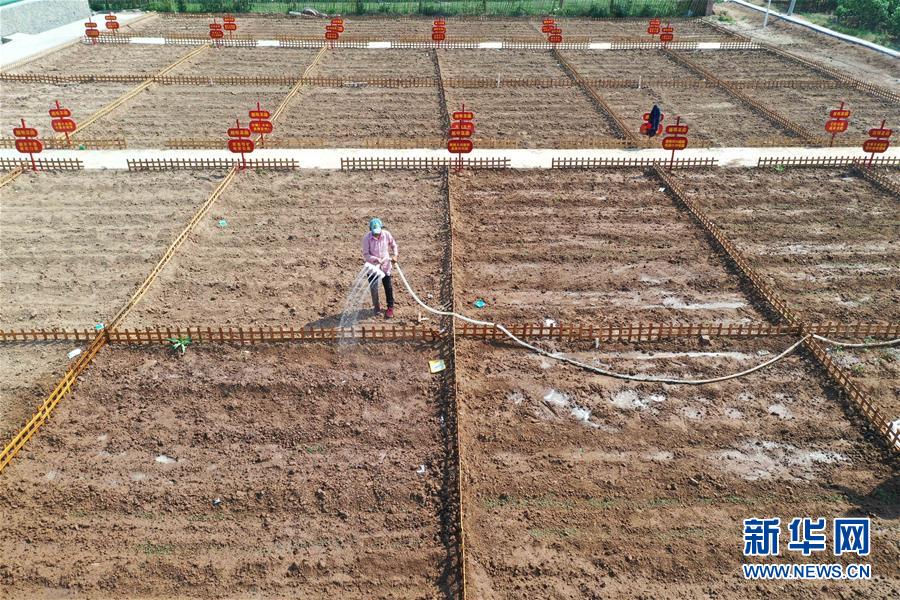5月1日,村民在河南省鶴壁市淇濱區(qū)鉅橋鎮(zhèn)崗坡村共享菜園里澆水(無(wú)人機(jī)照片)。 新華社記者馮大鵬攝