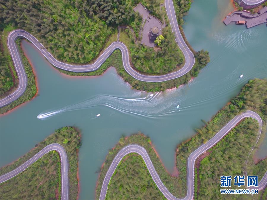 5月1日,在貴州省赤水市竹海國(guó)家森林公園里,游客乘坐快艇游覽竹海湖(無(wú)人機(jī)照片)。“五一”假日期間,人們以多種方式放松心情、享受假日。新華社發(fā)(張鵬攝)