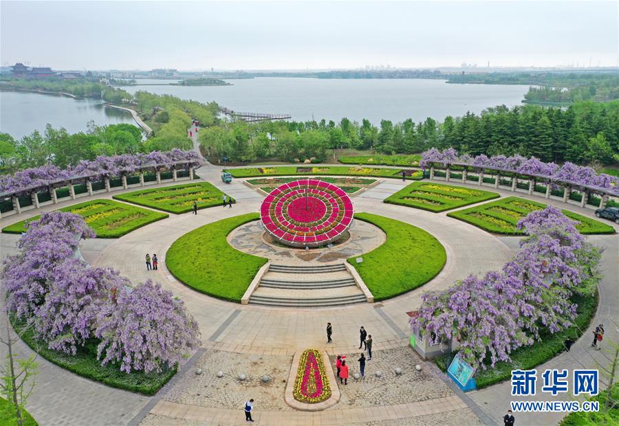 5月2日,游人在位于山東青島膠州市的青島大沽河省級生態(tài)旅游度假區(qū)賞花游玩(無人機照片)。“五一”假日期間,人們以多種方式放松心情、享受假日。新華社發(fā)(王昭脈攝)