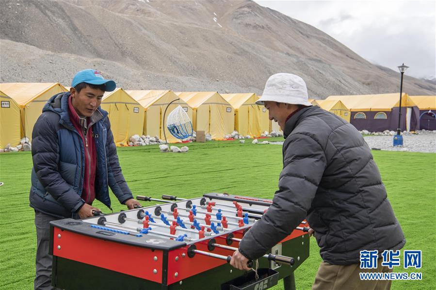 登山隊(duì)員在珠峰大本營玩桌上足球(5月1日攝)。新華社記者孫非攝