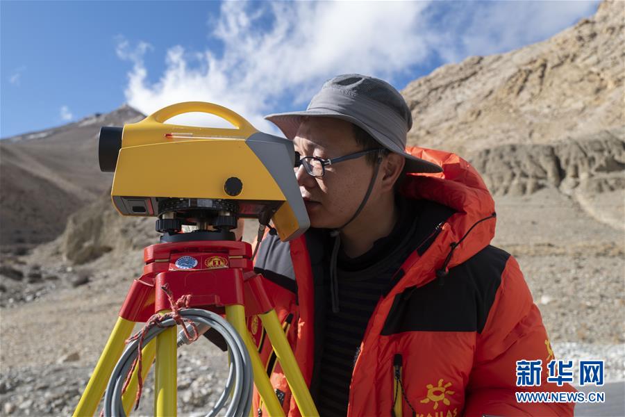國測一大隊隊員楊明在西藏定日縣曲當(dāng)鄉(xiāng)境內(nèi)進(jìn)行水準(zhǔn)測量(5月4日攝)。水準(zhǔn)測量是一種利用提供水平視線的儀器(如水準(zhǔn)儀、水準(zhǔn)標(biāo)尺),測定地面不同點(diǎn)之間的高差,并以此推算高度的一種方法,是經(jīng)典大地測量的重要技術(shù)之一。在目前正在進(jìn)行的2020珠峰高程測量中,部分國測一大隊隊員承擔(dān)了水準(zhǔn)測量的任務(wù)。新華社記者普布扎西攝