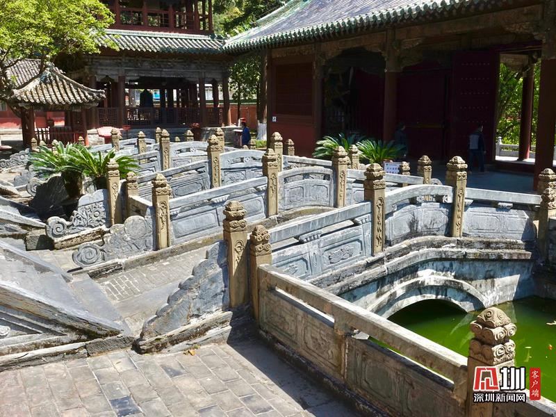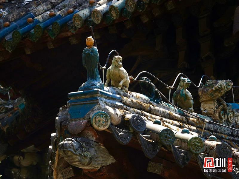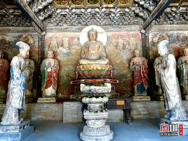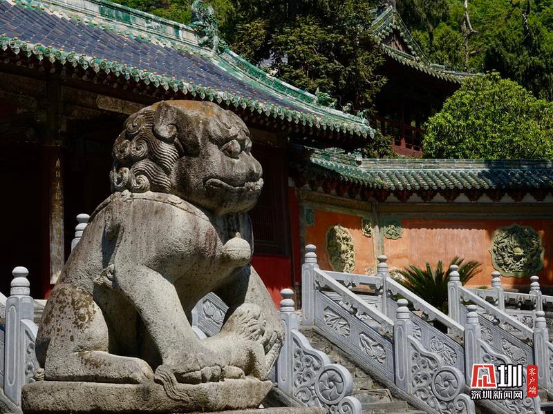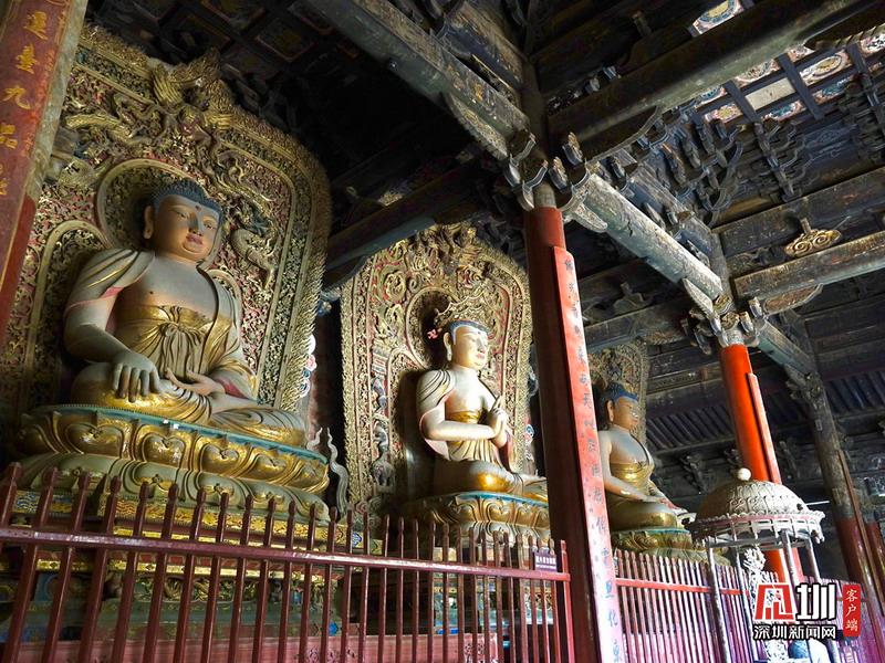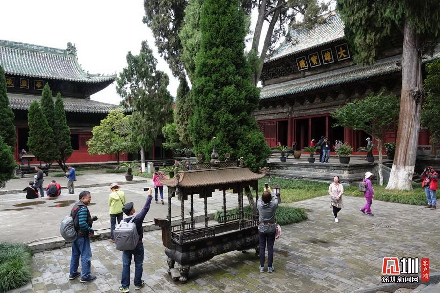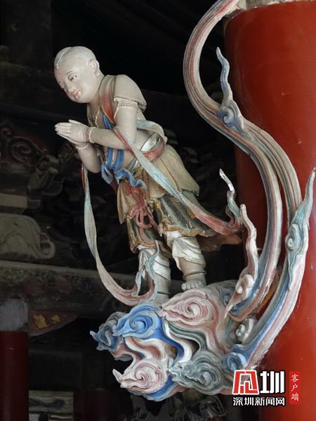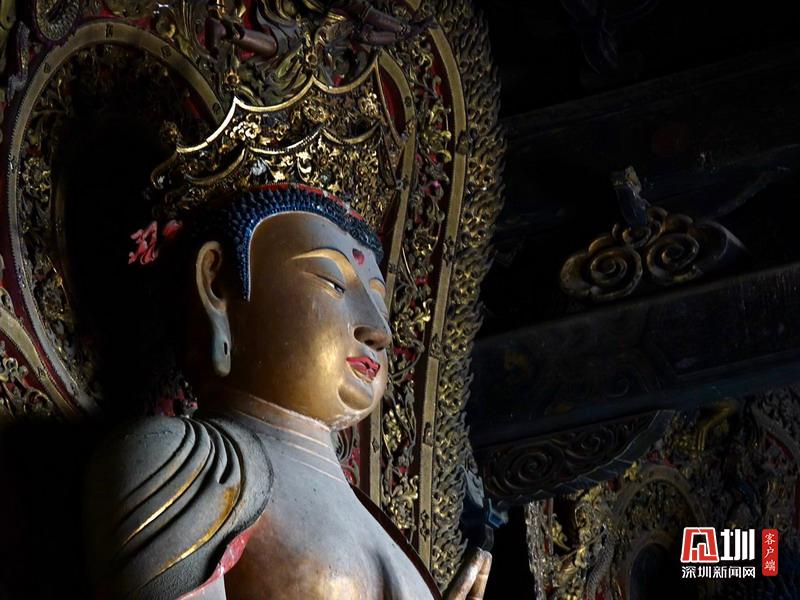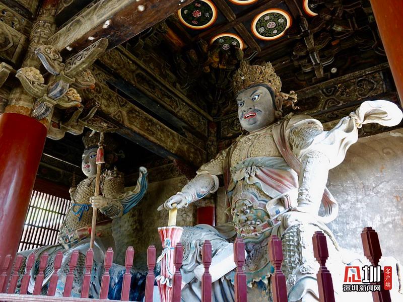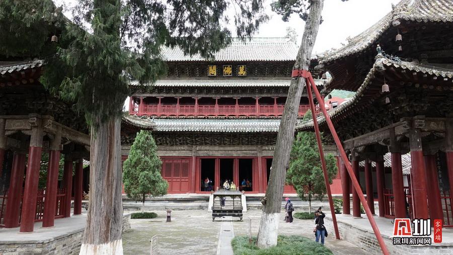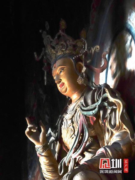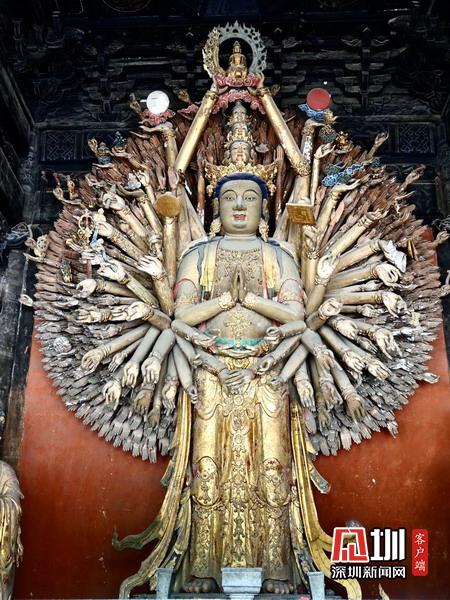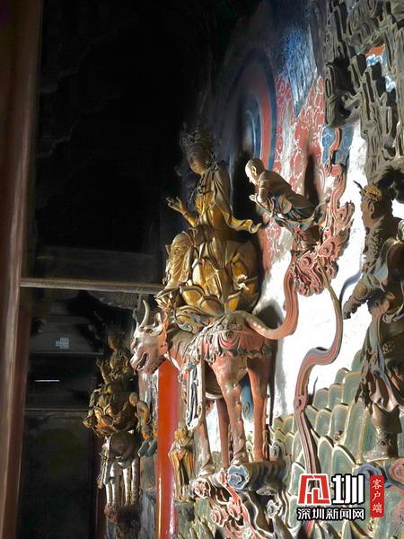 報恩寺布局結(jié)構(gòu)酷似北京紫禁城,被稱為“深山故宮”。寺內(nèi)古木參天,氣象森嚴(yán),飛檐凌空,金碧輝煌。大悲殿中的用整根楠木雕成的千手千眼觀音像、華嚴(yán)藏中的轉(zhuǎn)輪經(jīng)藏和泥塑蟠龍,以及遍布全寺的彩繪壁畫,都是世間罕見的藝術(shù)珍品。李仁奇攝