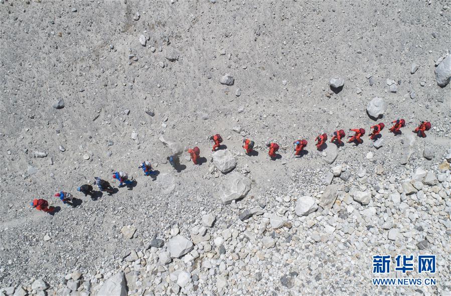 5月6日,登山隊(duì)員們向更高海拔進(jìn)發(fā)(無人機(jī)照片)。新華社記者晉美多吉攝