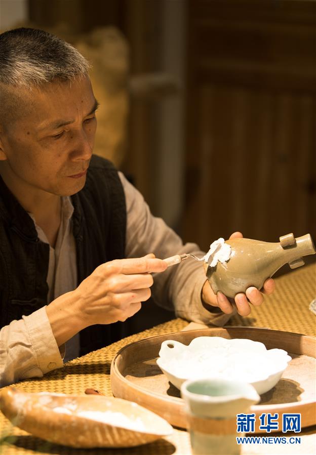 5月8日,項宏金在龍泉青瓷裝飾紋樣研究所修復古瓷器。1965年出生的項宏金,被浙江龍泉年輕一代瓷人稱為“項哥”,他從20世紀90年代開始收集龍泉青瓷標本,研究青瓷紋樣。2014年出版著作《龍泉青瓷裝飾紋樣》,次年開設龍泉青瓷裝飾紋樣研究所,將自己收藏的千余件標本跟瓷器愛好者、創(chuàng)作者免費分享。新華社記者翁忻旸攝