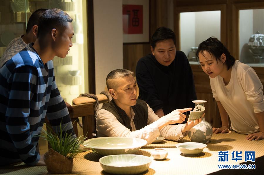 5月8日,項宏金(左一)在龍泉青瓷裝飾紋樣研究所向來訪的年輕瓷人介紹一件貫耳瓶。1965年出生的項宏金,被浙江龍泉年輕一代瓷人稱為“項哥”,他從20世紀90年代開始收集龍泉青瓷標本,研究青瓷紋樣。2014年出版著作《龍泉青瓷裝飾紋樣》,次年開設龍泉青瓷裝飾紋樣研究所,將自己收藏的千余件標本跟瓷器愛好者、創(chuàng)作者免費分享。新華社記者翁忻旸攝