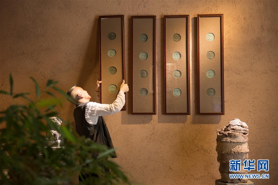 5月7日,項宏金在龍泉青瓷裝飾紋樣研究所懸掛用古青瓷標本制作的掛框。1965年出生的項宏金,被浙江龍泉年輕一代瓷人稱為“項哥”,他從20世紀90年代開始收集龍泉青瓷標本,研究青瓷紋樣。2014年出版著作《龍泉青瓷裝飾紋樣》,次年開設龍泉青瓷裝飾紋樣研究所,將自己收藏的千余件標本跟瓷器愛好者、創(chuàng)作者免費分享。新華社記者翁忻旸攝