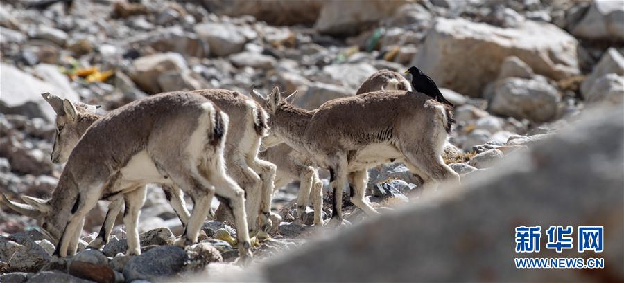 黃嘴山鴉停在巖羊背上(5月8日攝)。當(dāng)日,一群巖羊在珠峰大本營周圍覓食,黃嘴山鴉飛到巖羊身上停留,構(gòu)成一幅幅生動(dòng)有趣的雪域圖畫。新華社記者普布扎西攝