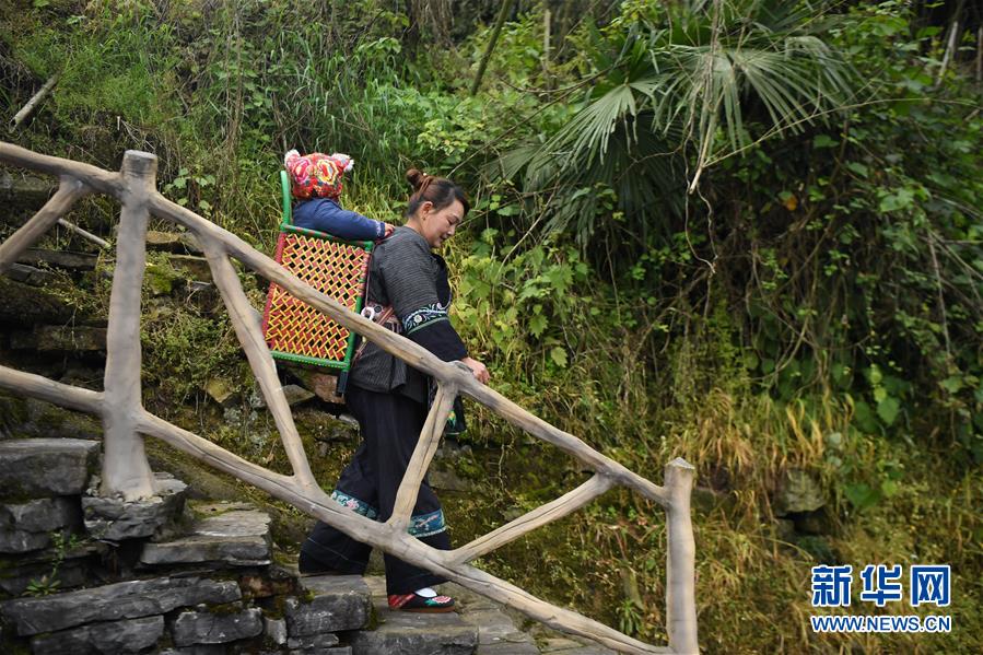 吳美金背著孫子走在十八洞村中,準(zhǔn)備前往村里的苗繡合作社(4月24日攝)。1967年出生的吳美金,1992年嫁入飛蟲村(現(xiàn)十八洞村飛蟲寨)時(shí),只有爛泥路的飛蟲村不僅田土少,掙錢活路也少,生活十分困難。2014年,吳美金加入了十八洞村苗繡特產(chǎn)農(nóng)民專業(yè)合作社,從小就會(huì)的苗繡傳統(tǒng)手藝如今成了家庭增收的法寶,不僅在家門口就把錢掙了,同時(shí)還能照顧年幼的孫子孫女。“現(xiàn)在的日子,比年輕的時(shí)候好多了?!眳敲澜鹫f。新華社記者薛宇舸攝