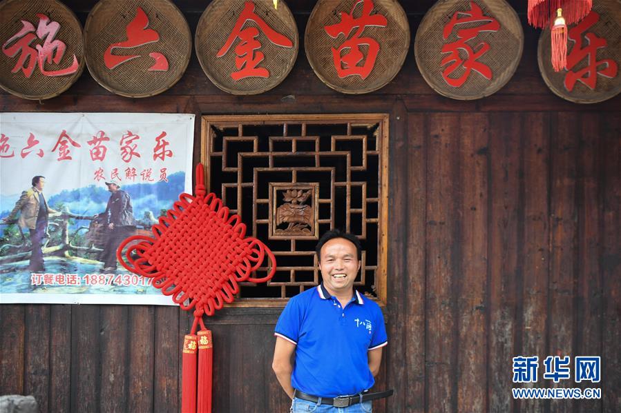 這是施六金在他的農(nóng)家樂前留影(4月25日攝)。1973年出生于十八洞村的施六金,由于父親患病很早就放棄學(xué)業(yè)和母親扛起了家庭的重?fù)?dān)。為了生活,他還曾遠(yuǎn)去東南亞打工。2015年,看到家鄉(xiāng)的變化,施六金回到村里開起了農(nóng)家樂,年度家庭人均純收入也從2014年的1715元增長(zhǎng)到了2019年的35696元。2018年,施六金與心愛的人組建了家庭。今年初,施六金與愛人迎來了一個(gè)大胖小子?!白鋈俗鍪乱没貓?bào)和感恩。”施六金給剛出生的兒子取名施澤恩。新華社記者薛宇舸攝