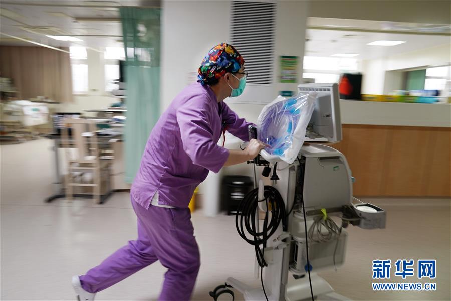 5月10日,在上海市普陀區(qū)中心醫(yī)院內科重癥監(jiān)護室,護士來文健在推運設備。新華社記者劉穎攝