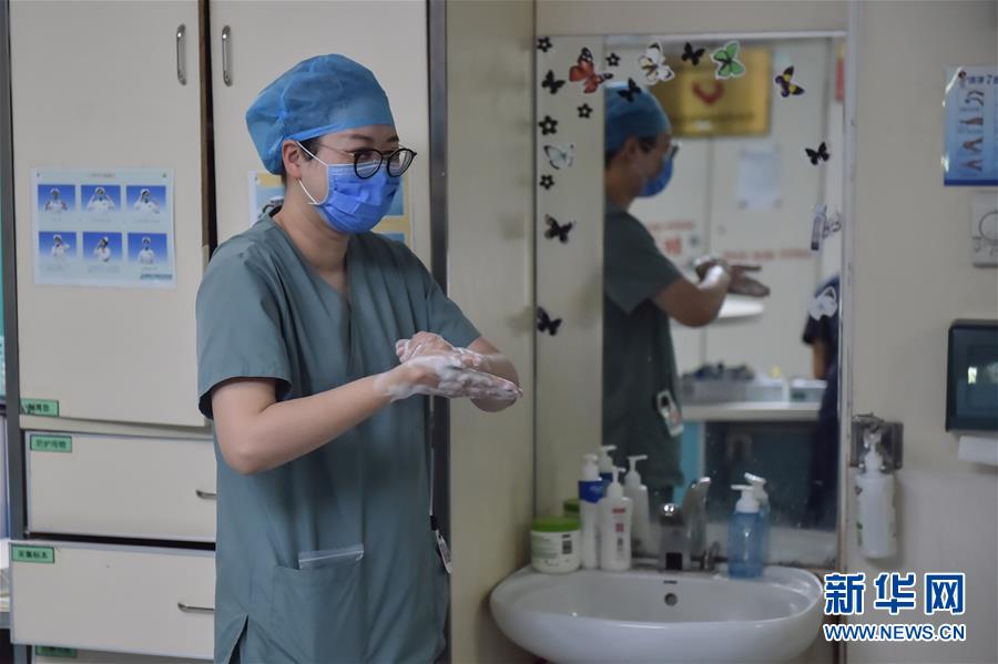 5月11日,在北京地壇醫(yī)院感染二科護(hù)士站,一名護(hù)士在洗手。北京地壇醫(yī)院是北京市收治新冠肺炎患者的定點(diǎn)醫(yī)院之一,醫(yī)院的醫(yī)護(hù)人員一直奮戰(zhàn)在抗擊疫情的一線。在國(guó)際護(hù)士節(jié)前夕,記者前往北京地壇醫(yī)院,記錄下抗疫一線護(hù)士的日常工作狀態(tài)。新華社記者彭子洋攝