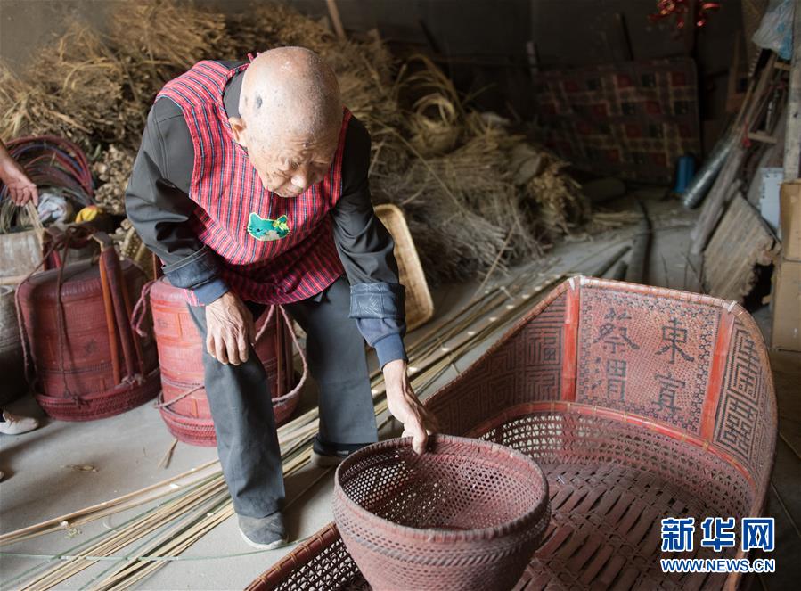 5月12日,浙江諸暨龍溪村的百歲老人蔡渭東在家中展示自己早年做的農(nóng)村婚事用的篾器。浙江諸暨東和鄉(xiāng)龍溪村有一位102歲的老人蔡渭東,他從12歲開(kāi)始拜師學(xué)藝,做了90年的篾匠,如今依然耳聰目明,每天堅(jiān)持編織篾器。蔡渭東老人說(shuō)他舍不得丟掉這份老手藝,也希望年輕人能傳承下去。新華社記者翁忻旸攝