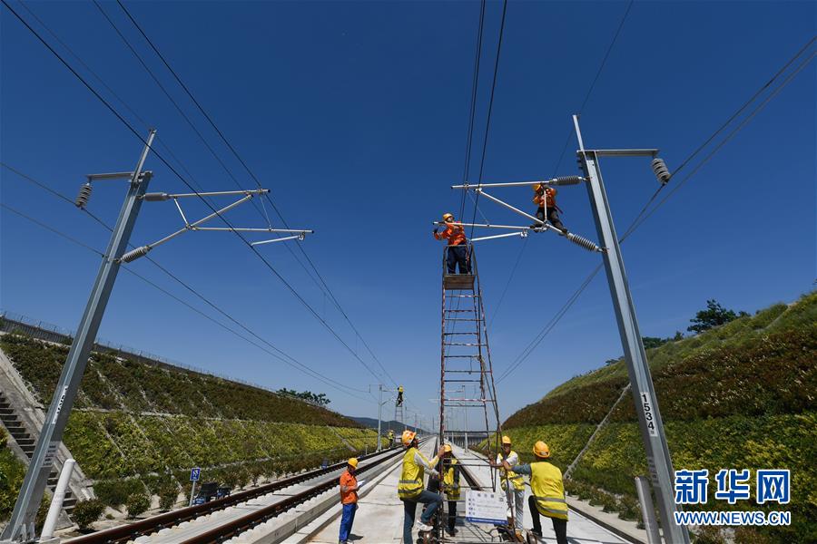 5月12日,中國鐵路上海局集團(tuán)公司上海高鐵維修段的技術(shù)人員在商合杭高鐵浙江湖州段調(diào)整接觸網(wǎng)導(dǎo)線。近日,商合杭高鐵合肥至湖州段聯(lián)調(diào)聯(lián)試正有條不紊進(jìn)行中。中國鐵路上海局集團(tuán)公司上海高鐵維修段抽調(diào)49名精兵強(qiáng)將,持續(xù)對管轄范圍內(nèi)的高鐵線路、信號、接觸網(wǎng)線進(jìn)行調(diào)試,為下一階段打下基礎(chǔ)。據(jù)了解,商合杭高鐵合湖段聯(lián)調(diào)聯(lián)試之后將轉(zhuǎn)入運行試驗階段,驗收合格并通過安全評估后,力爭6月底具備開通運營條件。新華社記者黃宗治攝