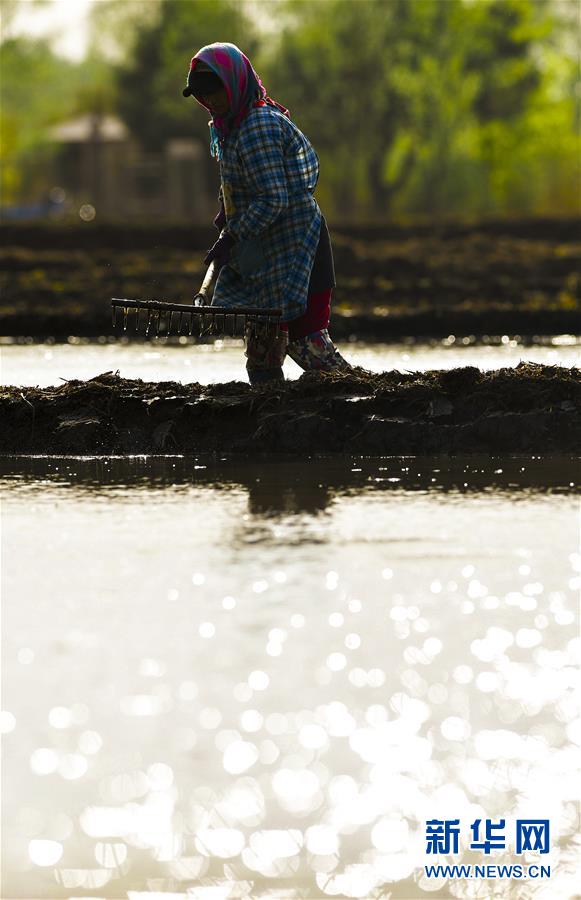 5月17日,在吉林省長(zhǎng)春市雙陽區(qū)徐家村,農(nóng)民在水稻田間耕作。新華社記者許暢攝