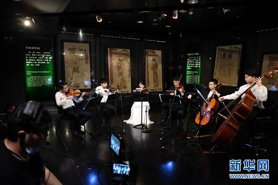 在陜西歷史博物館唐代壁畫珍品館,西安交響樂團小提琴首席周虎翼、第二小提琴首席白東旭、第二小提琴演奏員葉姣睿、中提琴演奏員時少愷、大提琴演奏員于丁和低音提琴演奏員趙子杰(從左至右)為“云上國寶”音樂會彩排(5月14日攝)。為迎接國際博物館日,5月14日,西安交響樂團走進陜西歷史博物館唐代壁畫珍品館,為5月18日的“云上國寶”音樂會彩排。觀眾將通過網(wǎng)絡(luò)直播,在聆聽天籟的同時欣賞國之瑰寶,感受藝術(shù)與美的和諧共鳴。新華社記者李一博攝