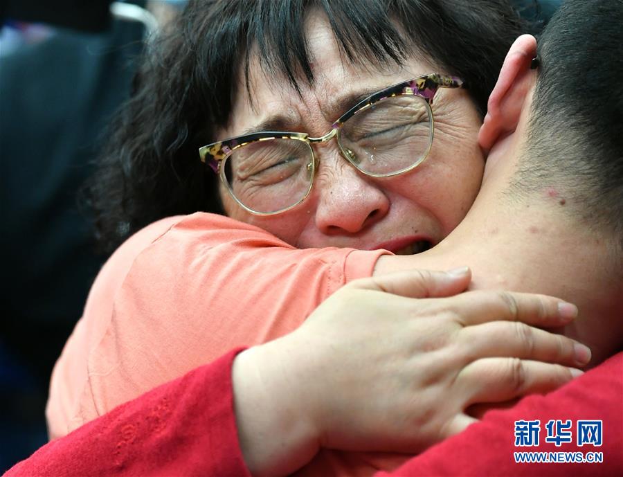 5月18日,李靜芝、毛振平(左)與失散32年的兒子毛寅擁抱。新華社記者張博文攝