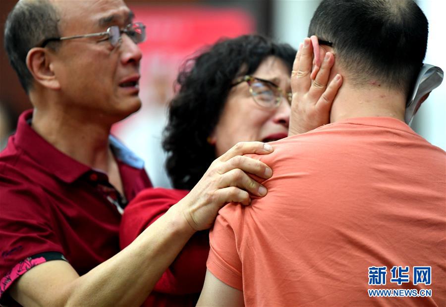 5月18日,李靜芝(左)與失散32年的兒子毛寅團聚時落淚。新華社記者張博文攝