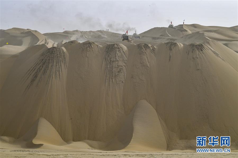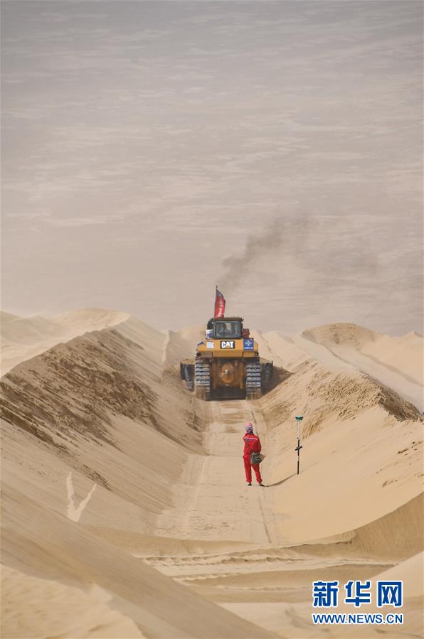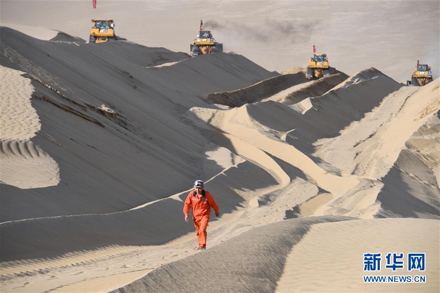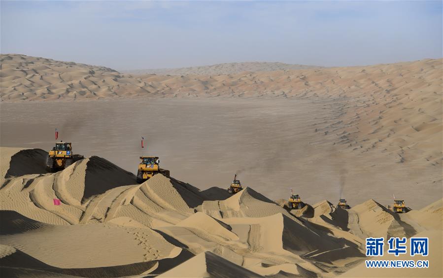 世界第二大流動(dòng)沙漠——塔克拉瑪干沙漠東部腹地,風(fēng)依舊在吹。極細(xì)的沙粒隨風(fēng)飄蕩,無(wú)孔不入。新疆尉犁至且末沙漠公路施工現(xiàn)場(chǎng)仍是機(jī)器轟鳴,多臺(tái)大型推土機(jī)一字排開(kāi),將高聳的沙山緩緩?fù)破健?/p>