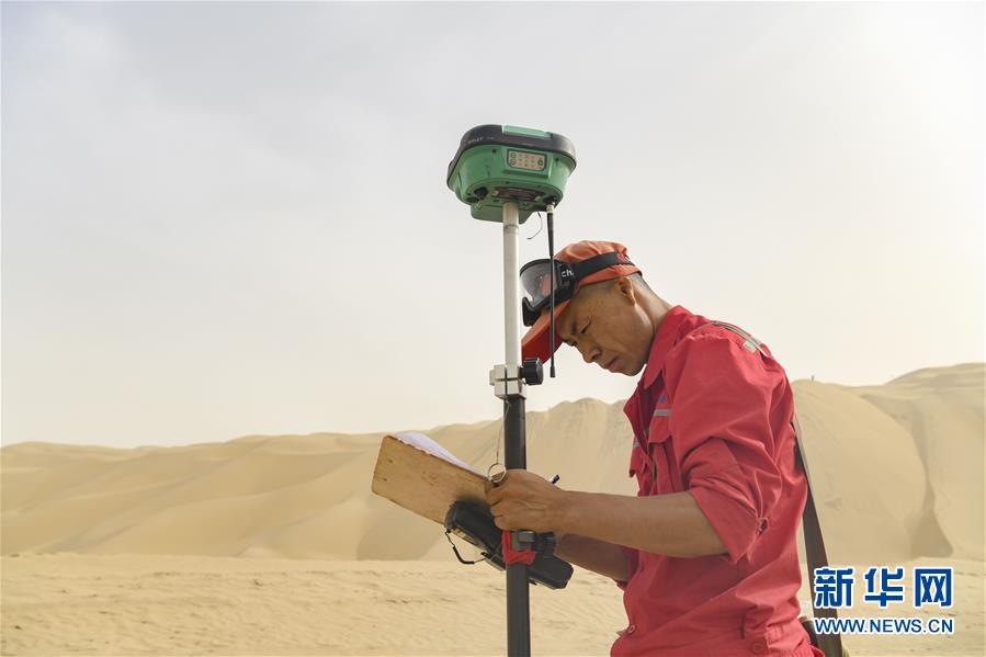 在新疆尉犁至且末沙漠公路施工現(xiàn)場(chǎng),測(cè)繪員劉耀軍在沙山旁測(cè)量并標(biāo)注施工線(5月17日攝)。新華社記者胡虎虎攝