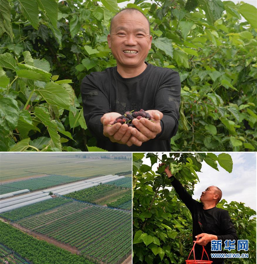 這是一張拼版照片(圖片均為5月16日攝)。上圖:河南省開封市尉氏縣大橋鄉(xiāng)十里鋪村村民孫根馬展示采摘的桑葚;下左圖:在扶貧政策扶持下,孫根馬流轉60多畝土地種植桑葚、葡萄、無花果等(無人機照片);下右圖:孫根馬在他經(jīng)營的桑葚種植園內采摘桑葚。新華社記者孫清清攝