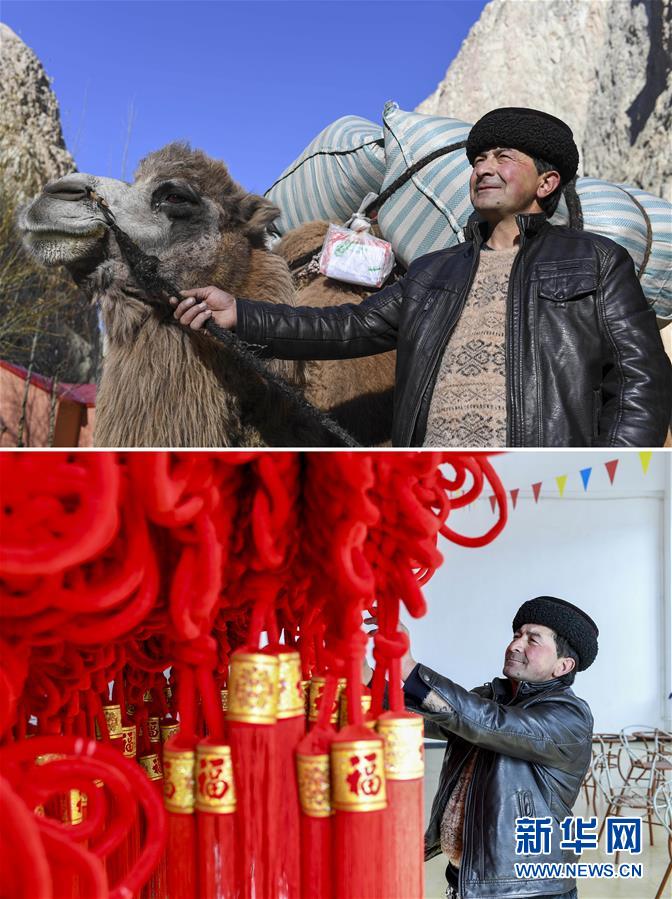 拼版照片上圖:都熱·加爾曼牽著馱有搬遷行李的駱駝走在喀喇昆侖山中(2018年11月17日攝);在塔什庫爾干塔吉克自治縣塔提庫力易地扶貧搬遷安置點(diǎn)的衛(wèi)星工廠,都熱·加爾曼在參觀由村民編制的手工藝品,他計(jì)劃讓妻子來這里上班(2018年11月18日攝)。2018年以來,新疆塔什庫爾干塔吉克自治縣對(duì)居住在艱苦偏遠(yuǎn)山區(qū)、生產(chǎn)生活資料匱乏、難以實(shí)現(xiàn)就地脫貧的358戶貧困戶,陸續(xù)實(shí)施易地扶貧搬遷,搬遷至距縣城約25公里的塔提庫力易地扶貧搬遷安置點(diǎn)。安置點(diǎn)還開發(fā)了耕地、草場(chǎng),建有衛(wèi)星工廠,確保像都熱一樣的貧困戶能穩(wěn)步增收脫貧。黨的十八大以來,我們堅(jiān)持以人民為中心的發(fā)展思想,明確了到2020年我國現(xiàn)行標(biāo)準(zhǔn)下農(nóng)村貧困人口實(shí)現(xiàn)脫貧、貧困縣全部摘帽、解決區(qū)域性整體貧困的目標(biāo)任務(wù)。目前看,脫貧進(jìn)度符合預(yù)期,成就舉世矚目。這些成績(jī)的取得,凝聚了全黨全國各族人民智慧和心血,是廣大干部群眾扎扎實(shí)實(shí)干出來的。脫貧摘帽不是終點(diǎn),而是新生活、新奮斗的起點(diǎn)。新華社記者胡虎虎攝