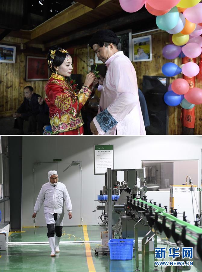 拼版照片上圖:婚禮開始前,吳春霞(左)為施六金佩戴胸花(2018年9月24日攝);下圖:施六金在十八洞村新建的山泉水廠里工作(2018年2月3日攝)。地處武陵山腹地的湖南湘西土家族苗族自治州花垣縣十八洞村曾深陷貧困。2013年,村里225戶中有136戶是貧困戶,40歲以上的“光棍兒”有30多人。2014年以來,十八洞村逐漸蛻變。2016年初,結(jié)束外出打工的施六金返鄉(xiāng)辦起“苗家樂”。2017年,村里的十八洞村山泉水廠正式建成投產(chǎn),他受聘成為廠里的技術(shù)工人,每月都有固定工資。隨著日子越過越好,許多像施六金這樣摘了窮帽的大齡“光棍兒”收獲了愛情,實(shí)現(xiàn)了安居樂業(yè),事業(yè)愛情雙豐收。黨的十八大以來,我們堅(jiān)持以人民為中心的發(fā)展思想,明確了到2020年我國現(xiàn)行標(biāo)準(zhǔn)下農(nóng)村貧困人口實(shí)現(xiàn)脫貧、貧困縣全部摘帽、解決區(qū)域性整體貧困的目標(biāo)任務(wù)。目前看,脫貧進(jìn)度符合預(yù)期,成就舉世矚目。這些成績(jī)的取得,凝聚了全黨全國各族人民智慧和心血,是廣大干部群眾扎扎實(shí)實(shí)干出來的。脫貧摘帽不是終點(diǎn),而是新生活、新奮斗的起點(diǎn)。新華社記者李尕?cái)z