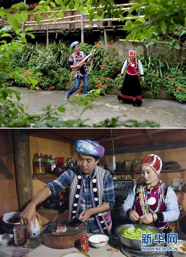 拼版照片上圖:郁伍林和魯冰花在客棧院子里彈唱歌舞(2017年5月27日攝);下圖:郁伍林和魯冰花為客人準(zhǔn)備晚餐(2017年5月26日攝)。云南省怒江傈僳族自治州福貢縣匹河怒族鄉(xiāng)老姆登村的郁伍林和妻子魯冰花,是該村開(kāi)辦農(nóng)家樂(lè)和客棧的致富帶頭人。夫妻倆還創(chuàng)建了茶葉品牌,幫助老姆登村怒族群眾把種植的生態(tài)茶葉銷(xiāo)往國(guó)內(nèi)外。在他們的引導(dǎo)和帶動(dòng)下,山寨的父老鄉(xiāng)親通過(guò)經(jīng)營(yíng)農(nóng)家樂(lè)客棧和種植茶葉逐步脫貧致富,日子越過(guò)越紅火。黨的十八大以來(lái),我們堅(jiān)持以人民為中心的發(fā)展思想,明確了到2020年我國(guó)現(xiàn)行標(biāo)準(zhǔn)下農(nóng)村貧困人口實(shí)現(xiàn)脫貧、貧困縣全部摘帽、解決區(qū)域性整體貧困的目標(biāo)任務(wù)。目前看,脫貧進(jìn)度符合預(yù)期,成就舉世矚目。這些成績(jī)的取得,凝聚了全黨全國(guó)各族人民智慧和心血,是廣大干部群眾扎扎實(shí)實(shí)干出來(lái)的。脫貧摘帽不是終點(diǎn),而是新生活、新奮斗的起點(diǎn)。新華社記者楊宗友攝