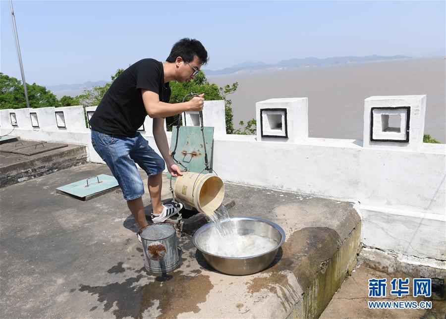 5月20日,在寧波七里嶼,葉家第五代燈塔工葉超群從水窖內(nèi)打水。為了克服淡水短缺的問(wèn)題,燈塔工收集雨水存入水窖作為生活用水。