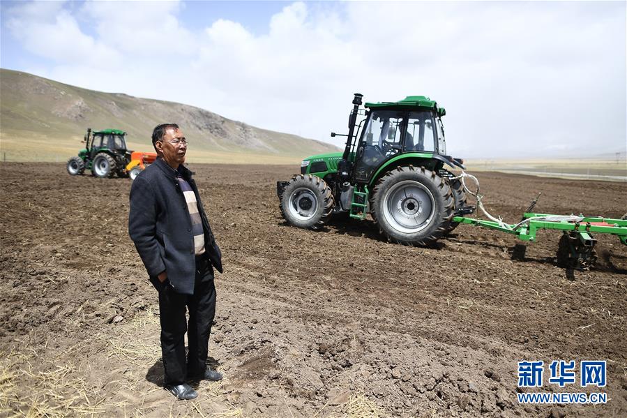 在青海省海北藏族自治州海晏縣青海湖鄉(xiāng)同寶村,者成倉在地里查看播種進(jìn)度(5月13日攝)。新華社記者張宏祥攝