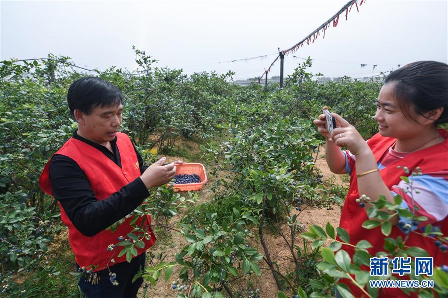 5月20日,長(zhǎng)興縣林城鎮(zhèn)上獅村的藍(lán)莓種植幫扶基地內(nèi),青年志愿者與種植戶通過(guò)手機(jī)直播藍(lán)莓的采摘,并介紹當(dāng)?shù)厮{(lán)莓生長(zhǎng)環(huán)境和品質(zhì),進(jìn)行網(wǎng)上銷(xiāo)售。新華社記者徐昱攝