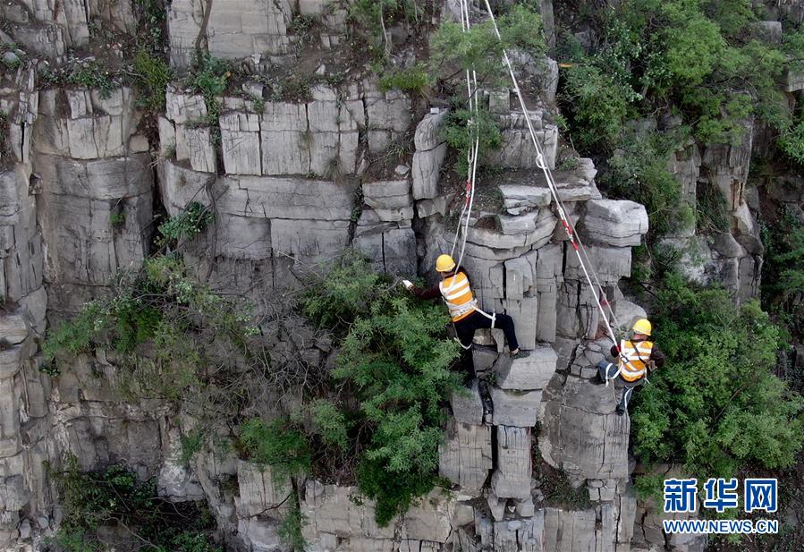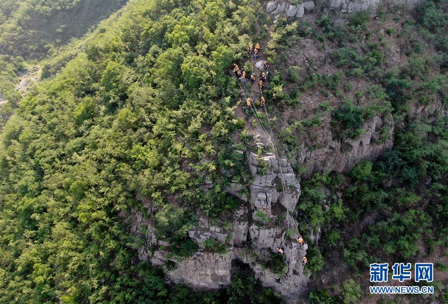 5月21日,捅山工胡軍從山頂垂降,準備開始捅山作業(yè)。新華社記者郝源攝