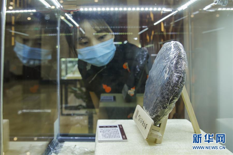 5月21日,在位于北京通惠河畔的中華古茶博物館,一名觀眾在首場展覽活動——“大道遺真:館藏普洱茶專題展”上觀看一餅“號級茶”。 當日,以“茶和世界 共品共享——茶,讓我們在一起”為主題的首個“國際茶日”萬里茶道系列活動在北京中華古茶博物館開啟。 新華社記者 張玉薇 攝