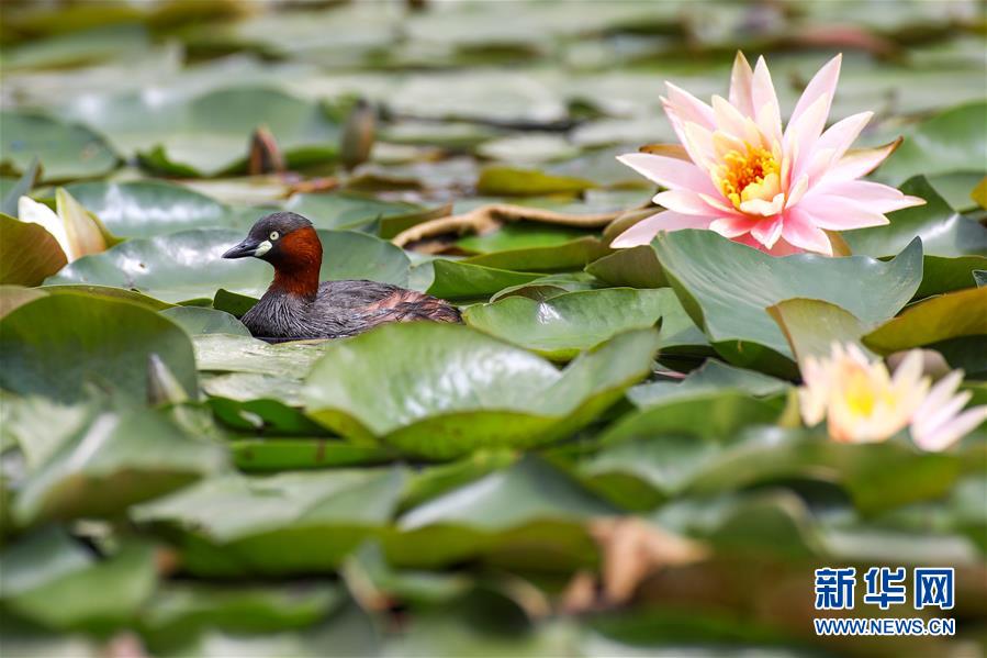 5月22日,一只在蓮葉間游弋。近日,貴陽(yáng)市觀山湖公園內(nèi)大片盛開(kāi)的蓮花吸引了不少水鳥(niǎo)在其間嬉戲覓食。新華社記者劉續(xù)攝
