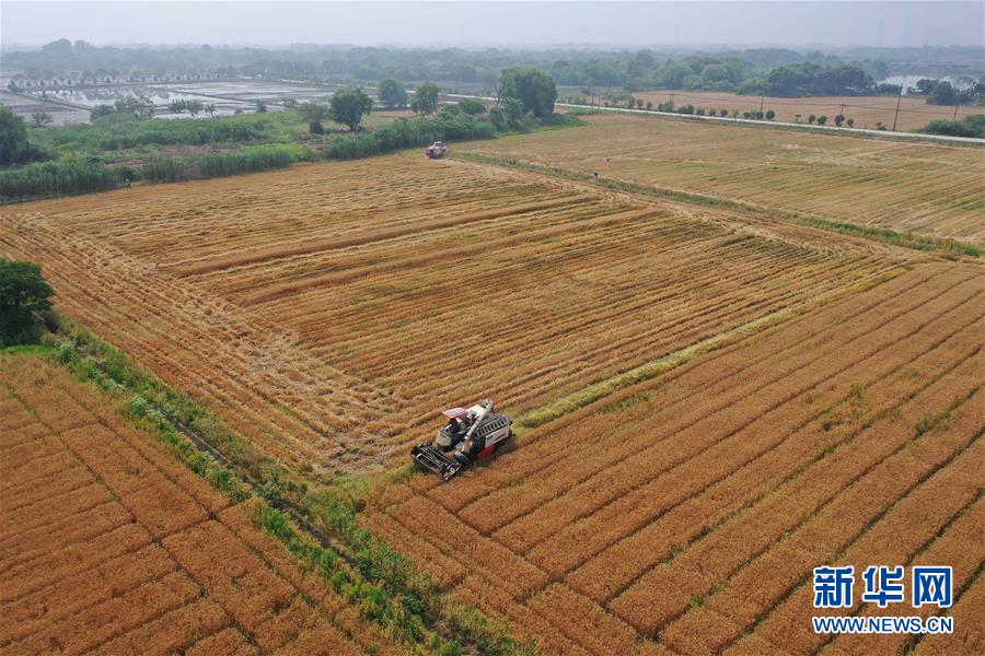 5月24日,農(nóng)戶駕駛收割機(jī)在浙江省湖州市吳興區(qū)八里店鎮(zhèn)尹家圩糧油植保農(nóng)機(jī)專業(yè)合作社的麥田里進(jìn)行收割作業(yè)(無人機(jī)照片)。新華社記者黃宗治攝