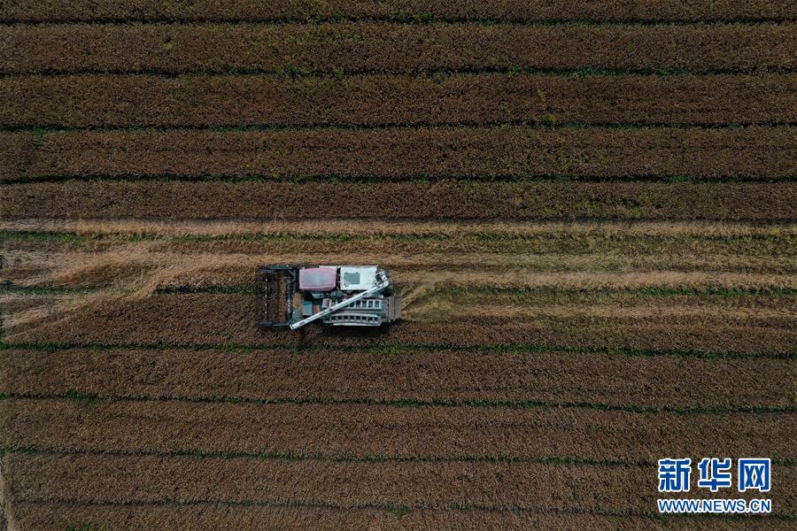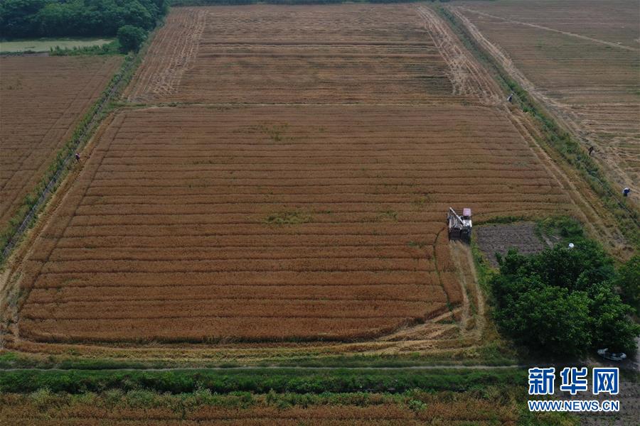 5月24日,農戶駕駛收割機在浙江省湖州市吳興區(qū)八里店鎮(zhèn)尹家圩糧油植保農機專業(yè)合作社的麥田里進行收割作業(yè)(無人機照片)。新華社記者黃宗治攝